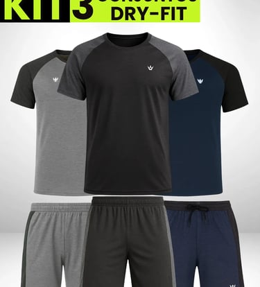 Treine com mais conforto e estilo! Adquira já seu kit com 3 conjuntos dry fit masculinos em malha lisa, ideais para academia e esportes. Aproveite essa oferta exclusiva e renove seu guarda-roupa fitness!