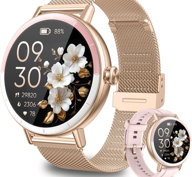 O KEEPONFIT Smart Watch é ideal para mulheres, compatível com Android e iPhone. Possui chamadas Bluetooth (atende e faz conexões), rastreador de atividades, pedômetro, monitor de frequência cardíaca e SpO2. Com resistência à água IP68 e mais de 100 modos esportivos, é perfeito para acompanhar sua saúde e exercícios diários.